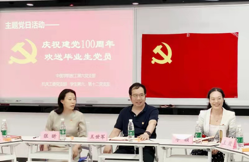 王世军经理指出,今天正值神舟十二号载人航天飞船成功发射之日,本次主题党日活动隆重举行。目前,中医药的发展正进入“天时,地利,人和”的新时代,各位党员同志要不忘初心,牢记使命,爱党爱国,为中医药的发展做出更大贡献。张昕书记从优秀员工、中国航天员中心医监医保研究室主任李勇枝教授谈起,她勉励毕业生党员应以优秀员工为榜样,“立大志”“立长志”,抓住中医药发展的大好时机,振兴中医药事业,为中华民族伟大复兴中国梦的实现做出贡献。非毕业生党员代表也纷纷对即将毕业的学长们送上祝福,希望师哥师姐在新的征程中能够继续奋发向上,努力前行。