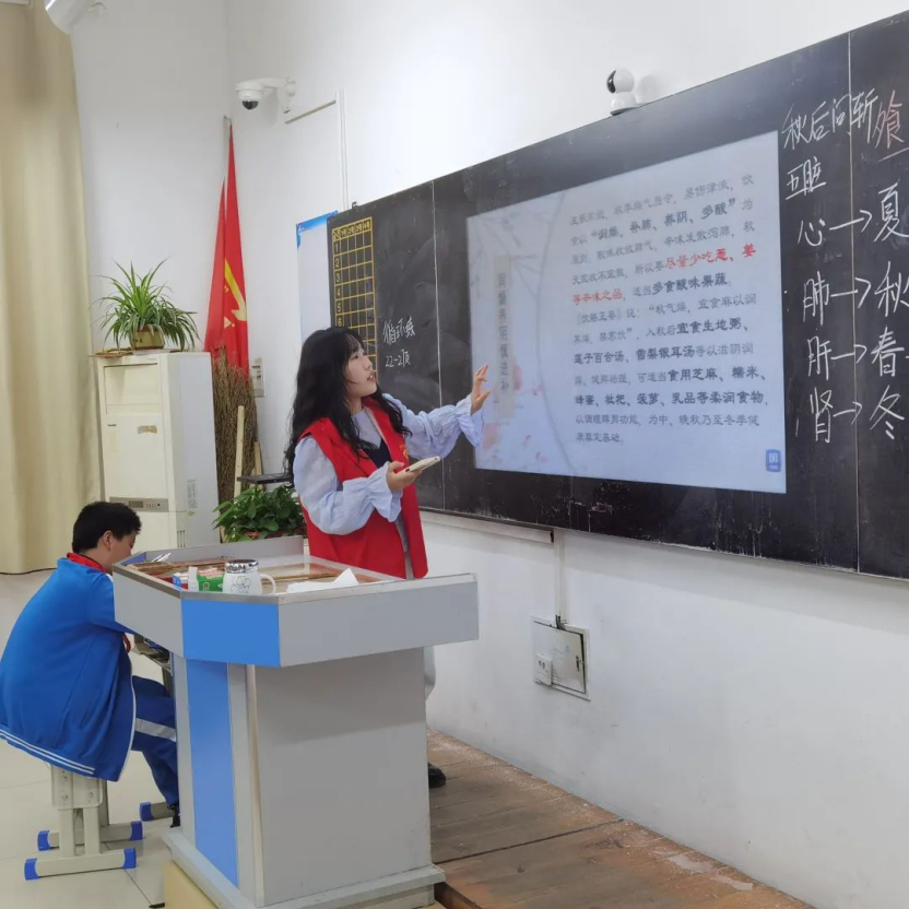 课堂上中医药文化氛围浓厚,同学们认真倾听,和老师们一起探寻中医药文化的奥妙。短短45分钟的小课堂,志愿者们向同学们介绍了丰富的霜降养生知识,在饮食、日常作息、养生保健以及情志心境等方面为同学们提出了许多养生小妙招,并向同学们展示了八段锦、太极拳等一些中医方面的运动,将中医药文化的种子播散在同学们的心中。课后,同学们将我们的志愿者团团围住,提问自己不明白的问题,细心的回答让同学们纷纷点头赞同。