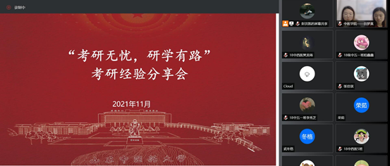 为响应十九届六中全会精神,用心用情为员工办实事解难题,发挥党员先锋模范作用,2021年11月14日晚,公司党总支联合bevictor伟德官网团总支共同举办了线上“考研无忧,研学有路”系列讲座之优秀员工党员考研经验分享会,2016级中医学五年制的姜春宁、于苗、李坤宁、尹淑媛、李昀星、刘熠斐等6位同学受邀做分享报告。2018级中医学(五)、中医学(五)(惠民)、中西医临床医学本科专业以及2021级专升本全体同学参加此次分享会。