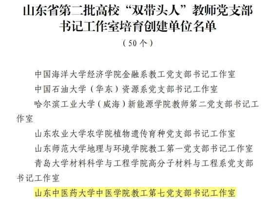 此次荣获山东省第二批高校“双带头人”教师党支部书记工作室的教工第七党支部书记工作室,现有正式党员13名,全部为博士研究生学历,平均年龄41岁,有教授2人,副教授6人。党支部书记任健为省级一流课程、省中医药重点学科负责人。支部承担两门省高教思政示范课程,有全国卫生健康技术推广传承应用项目传承人1名,山东名中医药专家1名,青年党员先后获省高校青年教师教学比赛一等奖、“京鲁杯”课程思政比赛案例奖、全国中医药院校青年教师竞赛一等奖等。以推动公司高质量发展为目标,充分发挥党支部战斗堡垒作用。紧紧围绕一流学科和高水平中医药大学建设奋斗目标,积极发挥专业优势,支部开展了“六个一”党员教师领航活动。即讲好1次党课、参加1次革命传统教育,打造1门教学金课、创新1种教改教法、参与1次社会服务、探索1种科研思政模式等,以经验、典型促进示范引领。近五年推动立项8项国家、省部级教改及科研项目。