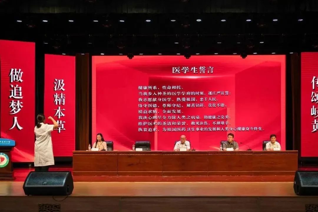 来自23级中医学(八年医)01班的新生代表杨沫上台发言,杨沫同学向全体分享了自己与古老神奇的中医药文化之间的不解之缘,她表示拼搏百日后与公司赴约的心情十分激动,并表示会传承好“博极医源,精勤不倦”的良好学风、践行好“厚德怀仁,博学笃行”的校训精神,做合格的山中医人。新时代中医学子肩负着传承中医药文化瑰宝的使命,“让中医药智慧持续为国家医疗事业做出独特贡献”是全体同学需要明确的未来目标。杨沫向全体同学提出“团结友爱,尊师重道”、“脚踏实地,行稳致远”、“明确目标,勤学善思”、“学以致用,开拓创新”的倡议,号召大家身着白衣立大志,早日成为栋梁材。