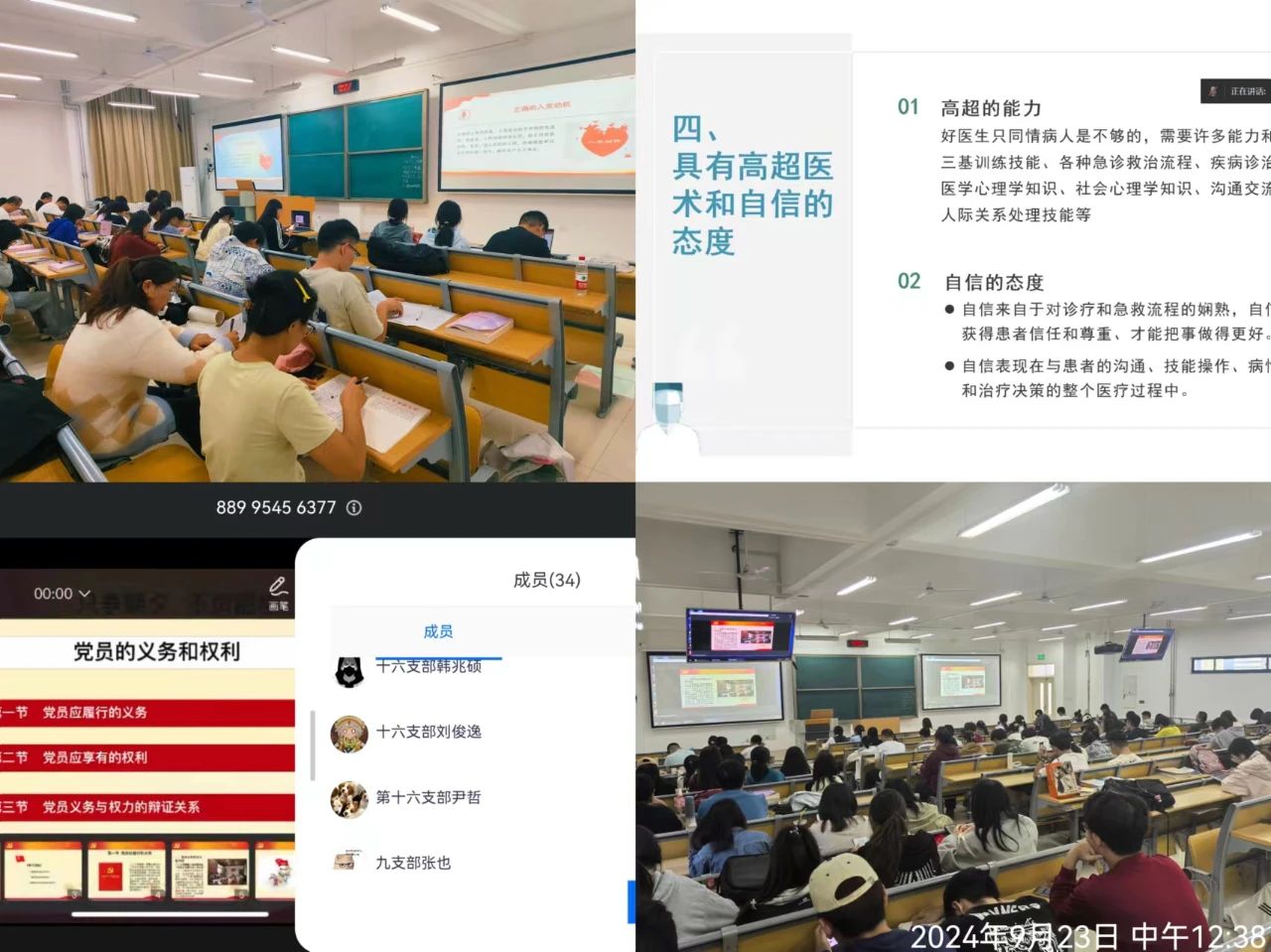 唐尊昊老师围绕习近平新时代中国特色社会主义思想,从“党员的权利与义务”等方面进行了精彩的授课,引领广大积极分子树立广大的共产主义理想;衣晓琨老师围绕“做好入党‘三问’,做合格党员”等主题提出了对积极分子的殷切期望;牟翔宇老师围绕“共产党人的党性与党性修养”等主题,带领培训班学员深入学习党的历史和优良传统作风;成兆万、王海镔两位老师开展了党史教育培训,引导学员们深入学习中国共产党的发展历程,包括党史、新中国史、改革开放史、社会主义发展史等;王磊老师以“如何成为一名优秀的临床医生”为主题,结合临床工作实际,为学员们全面阐述了习近平总书记关于中医药传承创新发展等方面的重要讲话和指示精神。