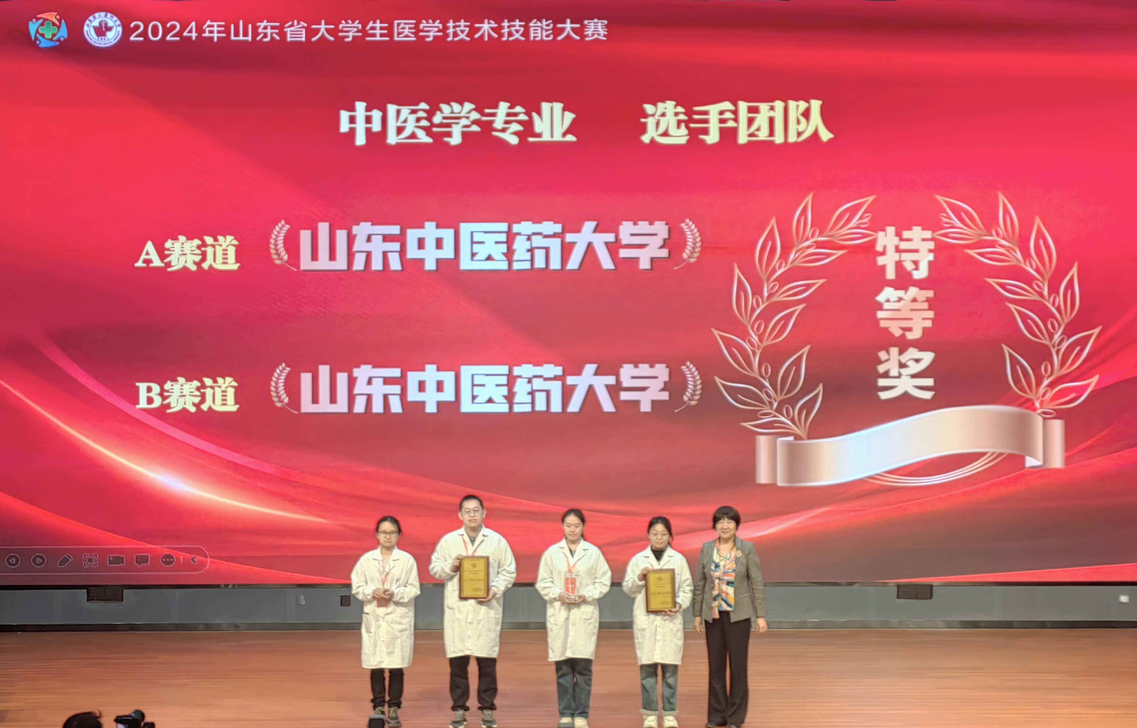 公司与针灸推拿公司组队参加中医学赛道的比赛,在此次山东省医学技能比赛中取得了优异成绩,公司中医学专业获得A赛道特等奖、B赛道特等奖以及高校团体金奖,A赛道张丁元同学在理论笔试、中医诊断技能、中医内科接诊以及针灸技能站连获4枚个人单项奖;A赛道毛学腾同学在方剂知识与运用、急救技能、针灸临床能力站连获3枚个人单项奖;A赛道王子雨同学在中药辨识与运用、中医外科操作站连获2项个人单项奖;B赛道田智涵同学在方剂知识与运用、急救技能站连获2枚个人单项奖。公司李毓秋老师斩获优秀指导教师团队奖。