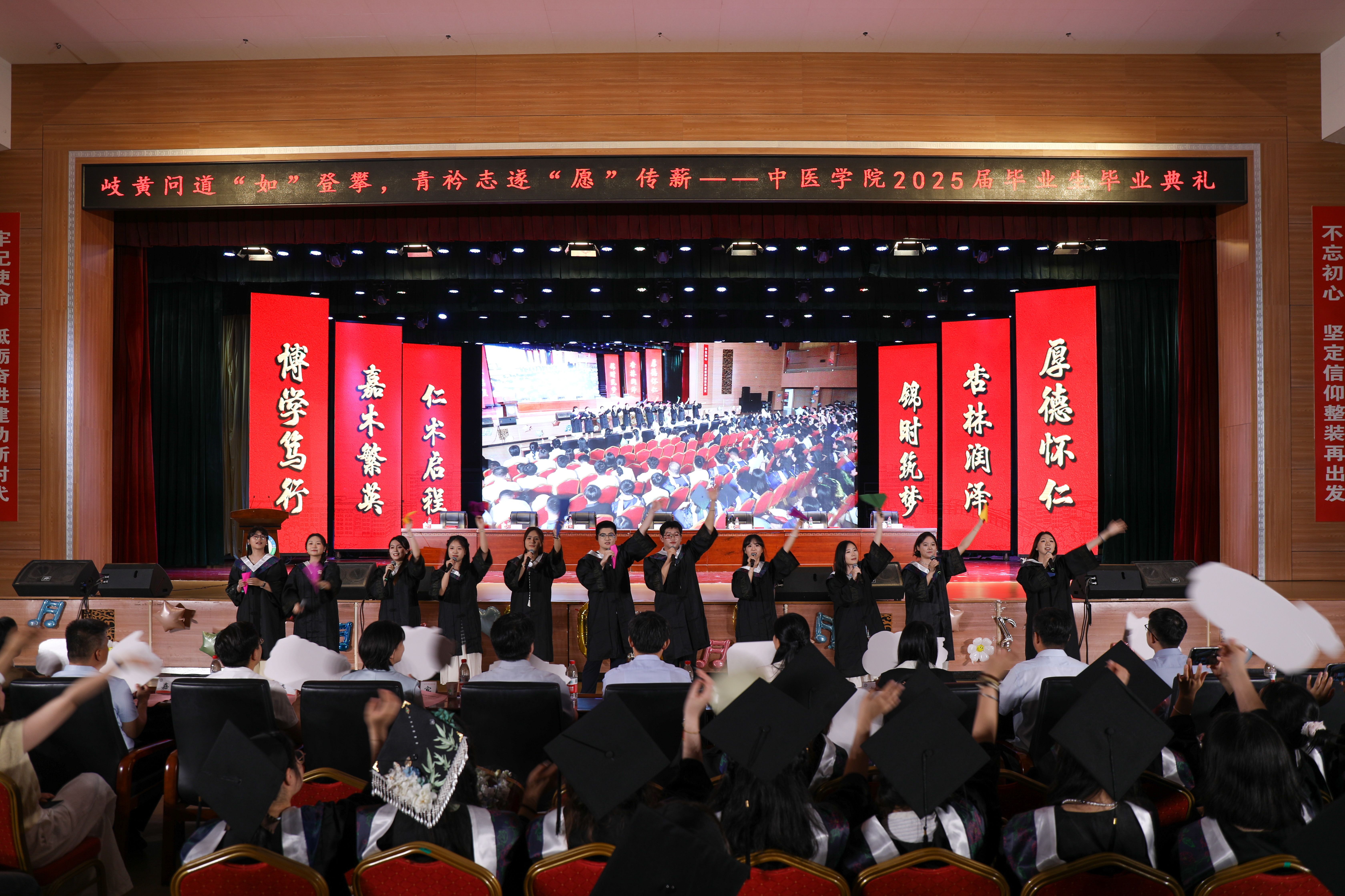 典礼暖场环节精彩纷呈,《裹着心的光》《勋章》《就是哪吒》等励志歌曲,展现毕业生昂扬向上的精神风貌。《一路生花》诉说着对未来的美好期许,《我是如此相信》传递着坚定的信念,《无名之辈》演绎着追梦路上的执着,《向阳而生》《去明天》则唱响了勇往直前的青春宣言。全体毕业生辅导员、教师代表深情合唱《青春大概》,为毕业生送上新征程最美好的祝愿和期待。