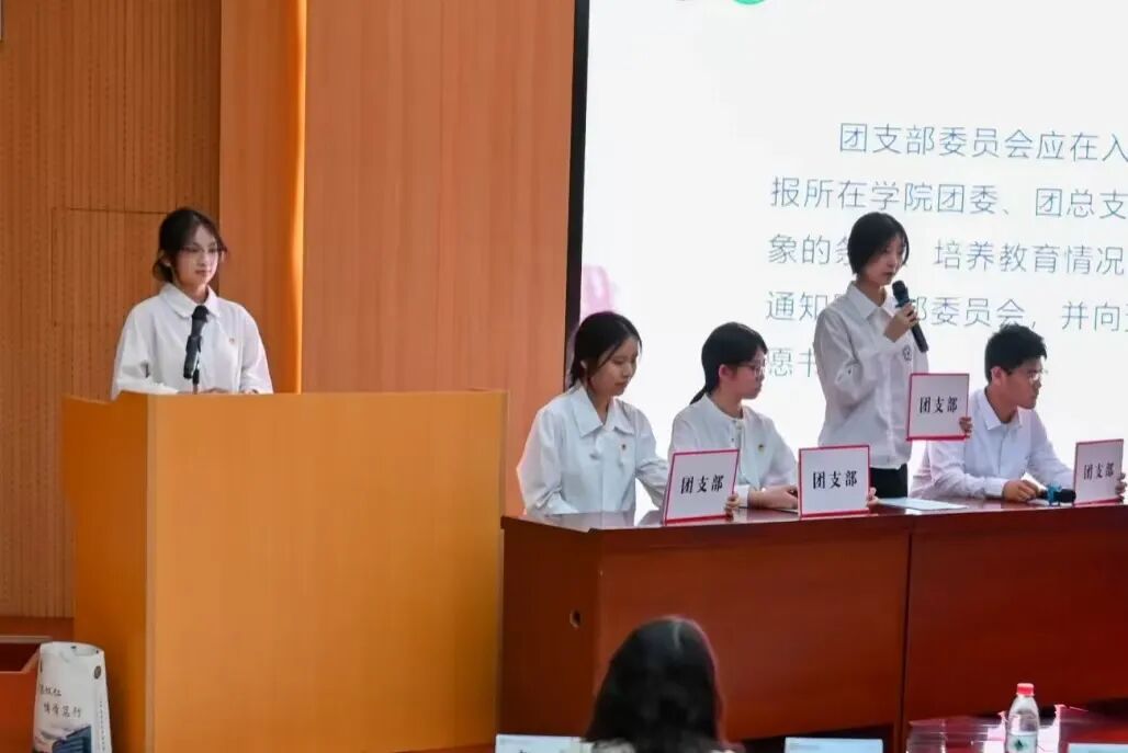 活动现场,主持人系统讲解了从入团申请、发展对象的确立到入团仪式等全过程的规范要求,同时对入团积极分子谈话、支部大会讨论表决、入团仪式等标志性场景进行现场演示,将严谨的规章制度转化为直观的情景再现,既彰显了团员发展工作的严肃性与规范性,也通过沉浸式体验深化了团员们对流程的理解。