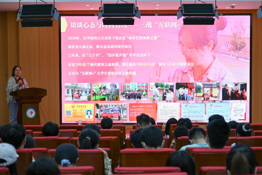 焦欣怡从个人经历引入,分享了学习时间安排和科研学习的小技巧,鼓励大家应善于利用网络资源和平台,进行开放式的学习,通过讲述自己参赛与创新创业的经验,鼓励同学们在认真学习专业课程知识的同时,也要积极参与校内外各项专业比赛活动。