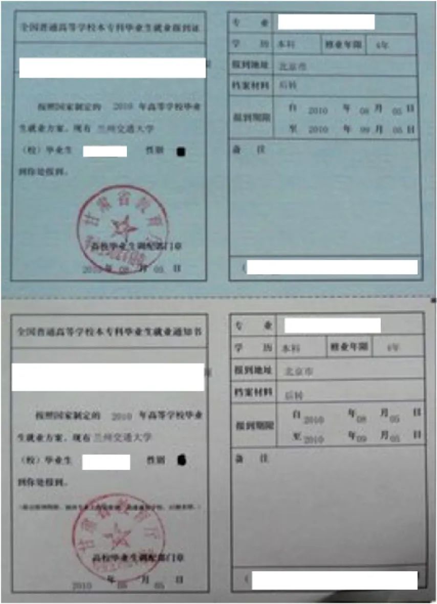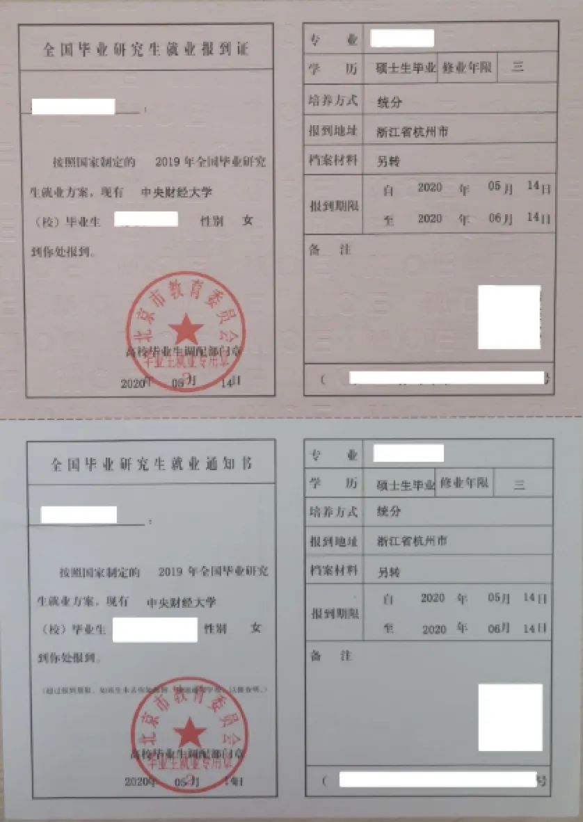 报到证就稍微复杂一点,一张纸分上下两联(内容一样,但是颜色不同),上联本科生是蓝色,研究生是粉色,下联都是白色。上联我们拿着它去单位报到,下联放到我们档案里面存档。上次我们知道我们的档案最终有2个去向,一种是去接收单位,一种是二分回生源地。那么,报到证也有2种打法,一种抬头打单位,一种抬头打生源地人社部门。抬头打单位的,户档和人直接去单位了;抬头打二分回生源地的流程是这样,人拿着报到证上联和户口迁移证,先到派出所把户口落下,然后再去人社部门办理存档手续,办理好之后再拿着报到证上联去单位报到,单位可以接受档案的,单位出调档函将档案从生源地人社部门调到单位,单位不能接受档案的,档案放在生源地人社部门即可。这么看来,报到证上联用于单位报到及办理户口;报到证下联用于迁转档案。