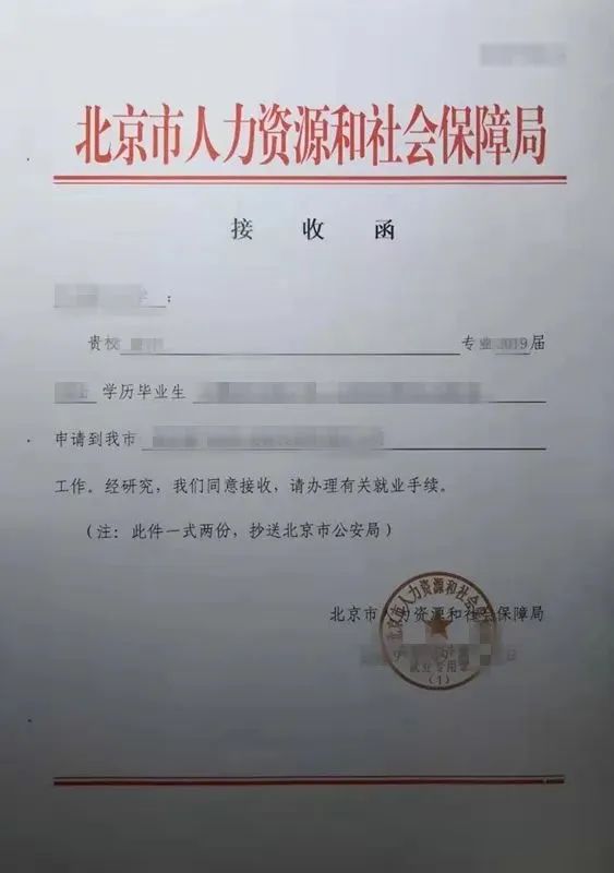 2.北京市属单位,由北京市人力资源和社会保障局批给北京市属单位,接收函是北京市人社局的红头文件,我们俗称“红头文件”。拿到这个就拿到了户口指标,将“红头文件”复印件直接返给公司,公司办理报到证即可。