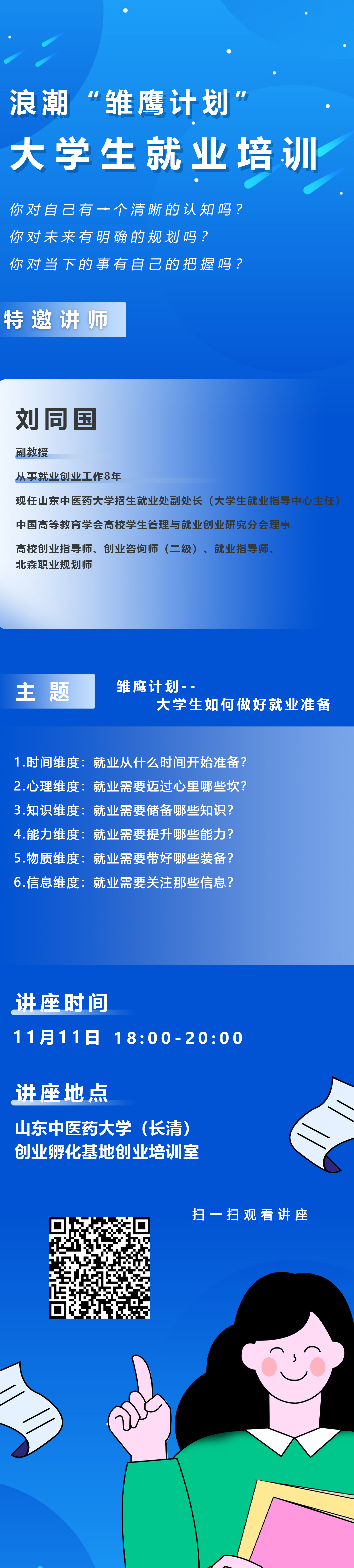本次课程邀请公司老员工就业指导中心刘同国老师授课,从时间、心理、知识、能力、物质和信息等六个维度来指导大家做好就业准备,请大家扫描海报中的二维码观看。后续精彩培训,请大家继续关注“山中医智就业服务平台”或者“bevictor伟德官网就业信息网——就业课堂”。