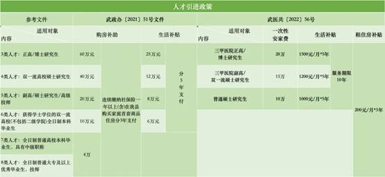 包括基本工资、绩效工资、年终绩效、津贴补贴等,收入在同地区、同类型医院具有优势。依法缴纳五险一金,包括养老、医疗、生育、工伤、失业、住房公积金。鼓励继续深造及出国留学,期间保留聘用岗位、暂存基本工资、正常缴纳社保,特殊人才报销学费。包括提供食宿、员工旅游、进修培训、健康查体、本人及亲属就医绿色通道等福利,提供国外短期学习或参加境外国际学术会议交流机会,协助落实配偶工作、解决子女入学,高层次人才过渡性住房及独立公寓,科研启动费、安家费等。