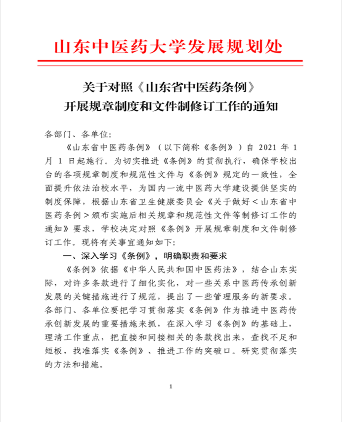 关于对照《山东省中医药条例》开展规章制度和文件制修订工作的通知