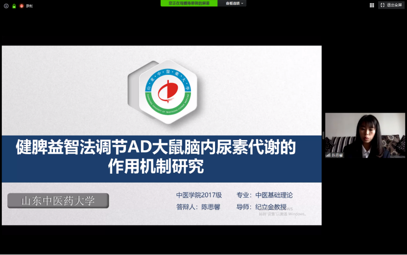 陈思馨博士首先进行“健脾益智法调节AD大鼠脑内尿素代谢的作用机制研究”为题的答辩汇报,魏凤琴、甘慧娟、张庆祥、王苹、纪立金五位答辩专家一一提问并提出修改建议。