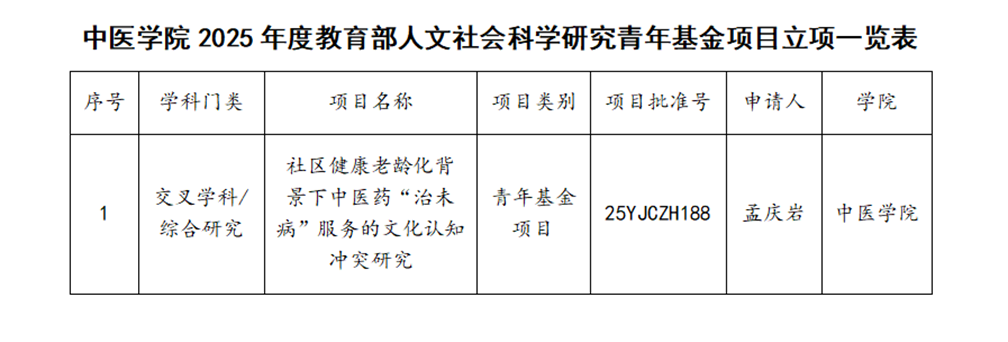 122日,教育部社科司发布2025年度教育部人文社会科学研究一般项目立项的通知。公司教师孟庆岩主持的《社区健康老龄化背景下中医药“治未病”服务的文化认知冲突》获批青年基金项目,实现了公司在该类项目立项上“零的突破”。