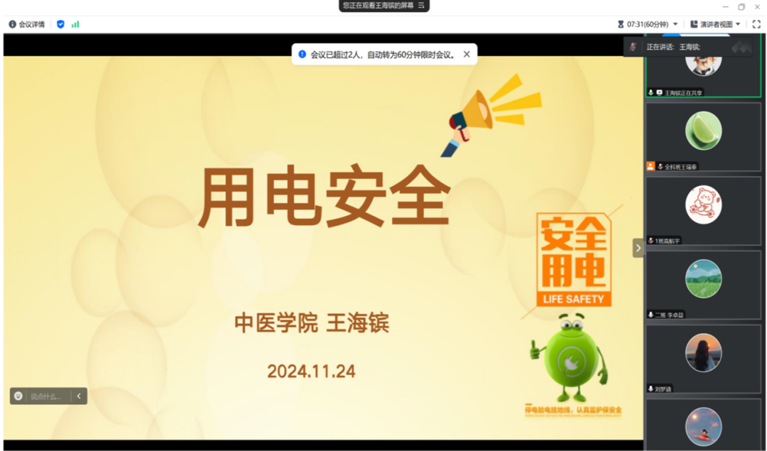王海镔通过线上线下结合的方式召开了“安全用电,你我有责——老员工用电安全”主题班会。他通过案例展示与分析、常见用电常识介绍等环节,让员工们了解了用电安全和火灾预防手段及防范要点。互动环节更是检验并巩固了员工们的用电安全知识。此次班会增强了员工们的防范意识,为保护生命财产安全奠定了基础。