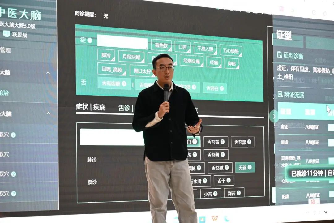 随后的企业宣讲会,崔祥瑞详细介绍了问止中医的发展历程、企业文化、技术实力及未来规划。他们以科技创新中医、疗效第一为使命,以攻克人类重症、疑难症为愿景,分享了如何利用大数据、云计算等先进技术为传统中医诊疗注入新活力。在互动环节,副总裁付海城现场演示“中医大脑”的操作流程,与同学们进行了深入探讨。