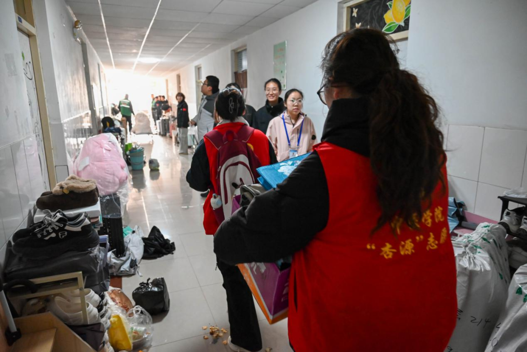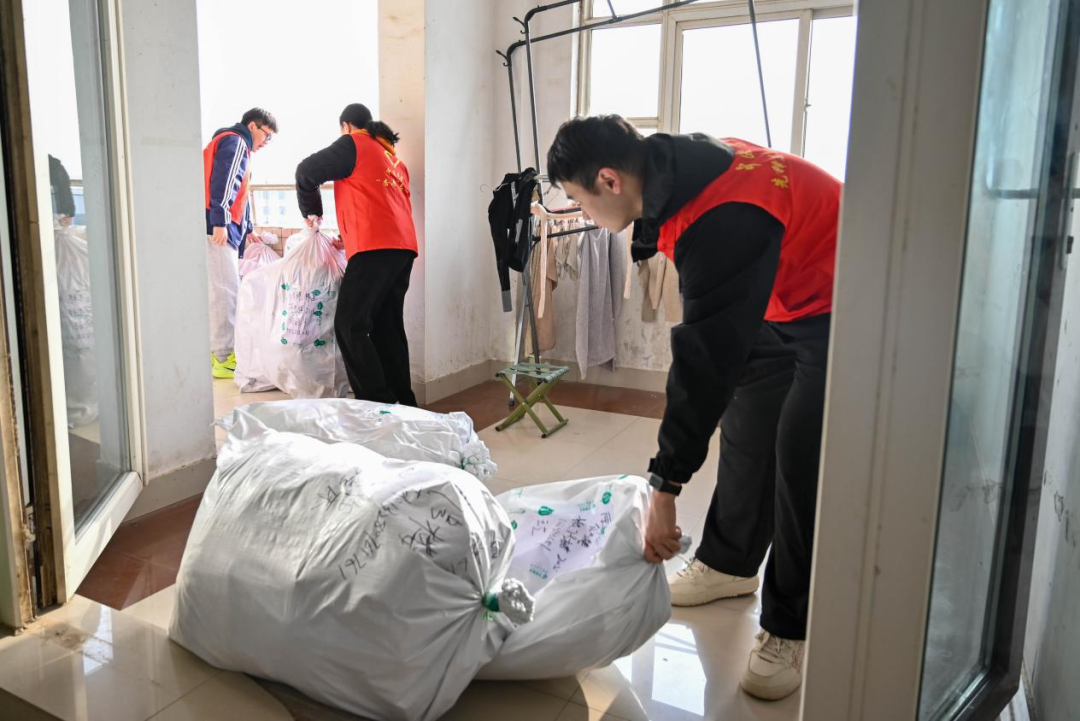 搬迁现场,志愿者们分工协作,干劲十足,主动帮助同学们搬运大件行李、整理个人物品,穿梭在楼道间不辞辛劳。